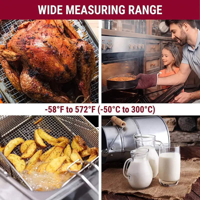 304 stainless steel probe with ergonomic handle for accurate temperature checks. Perfect for steak, chicken, pork, BBQ, oven, and fryer cooking.